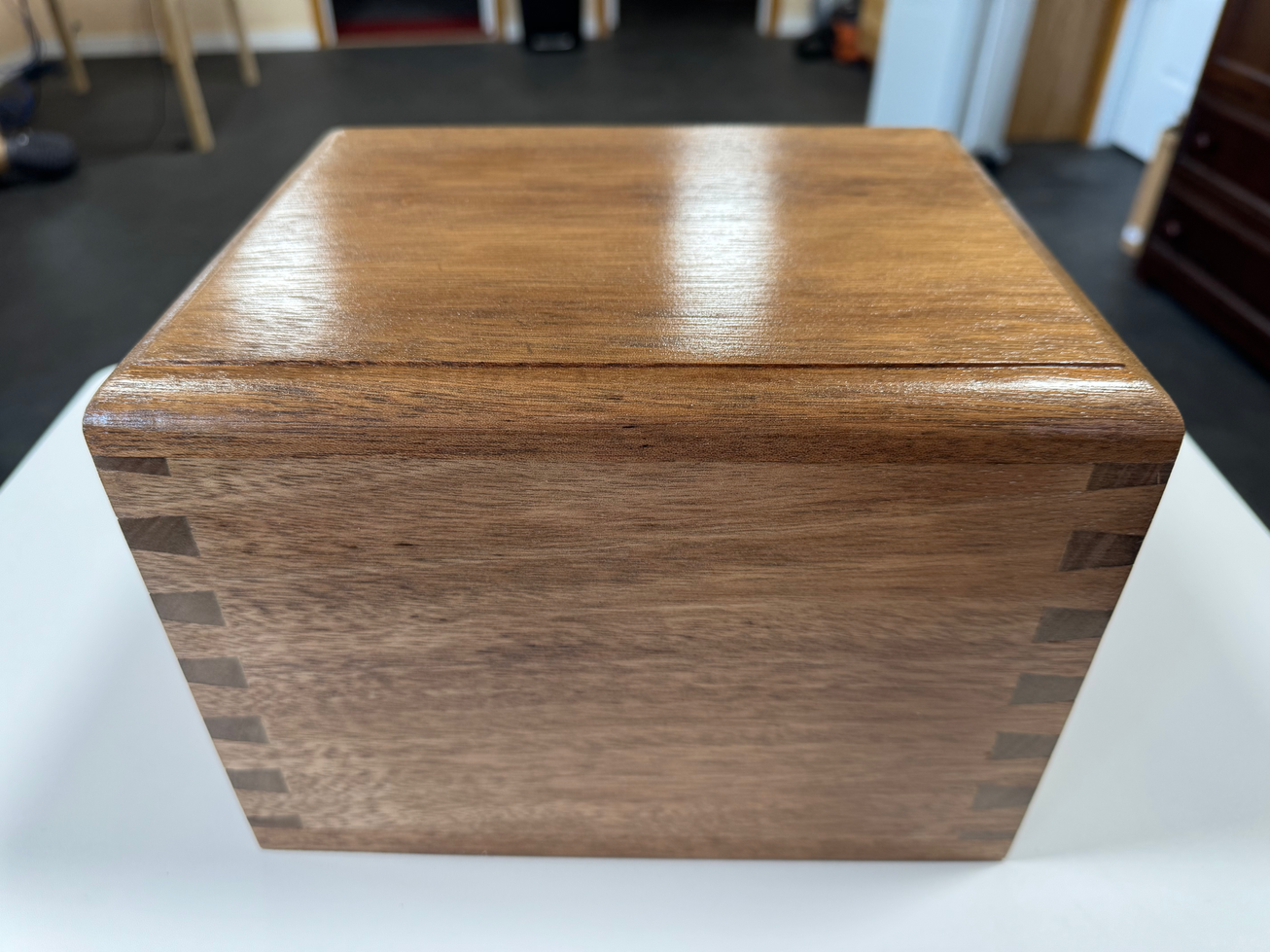Each urn is carefully built in our small workshop, shaped and sanded by hand, and finished with a protective satin coat that enhances the wood’s natural depth and glow. Over time, mahogany develops a rich, luminous patina, making this urn an enduring tribute that becomes even more beautiful as the years pass.